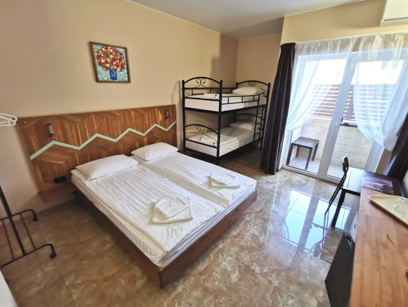 Стандартный номер с двухспальной кроватью и двухъярусной кроватью для комфортного проживания семьи с двумя детьми. В номере имеется собственный санузел с душевой кабиной, кондиционер, холодильник и балкон.